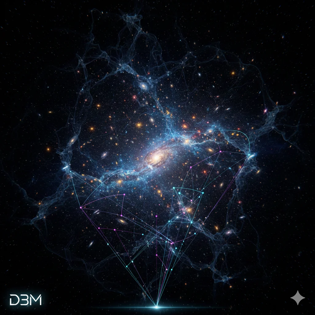 Imagine A stunning, artistic rendering of the cosmic web – a vast network of galaxies and dark matter. It should have a sense of deep space, mystery, and i