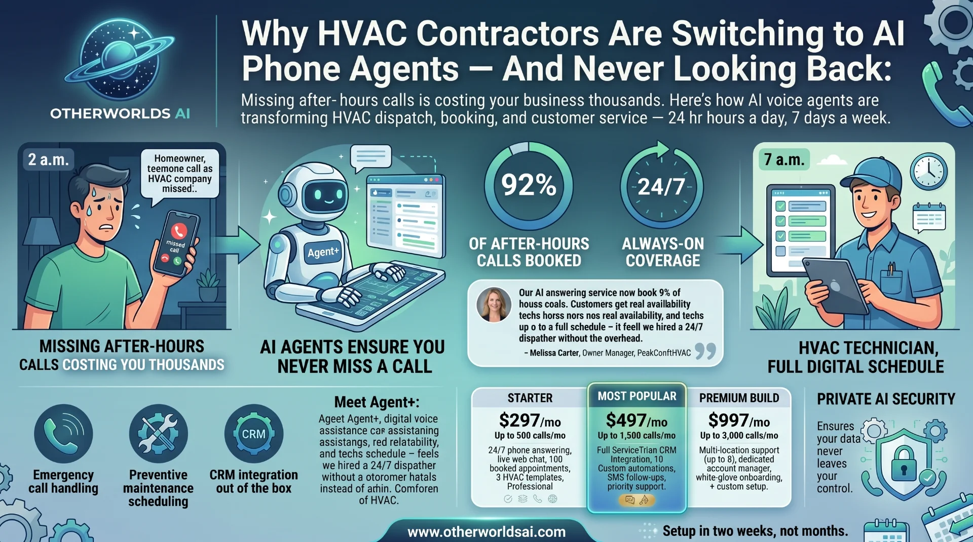 For most HVAC contractors, this scenario plays out dozens of times every month. Missed calls mean missed revenue — and in a business where emergency service calls command premium rates, the cost of going unanswered adds up fast. That's exactly the problem Otherworlds AI built their Agent+ HVAC Voice & Chat solution to solve.
